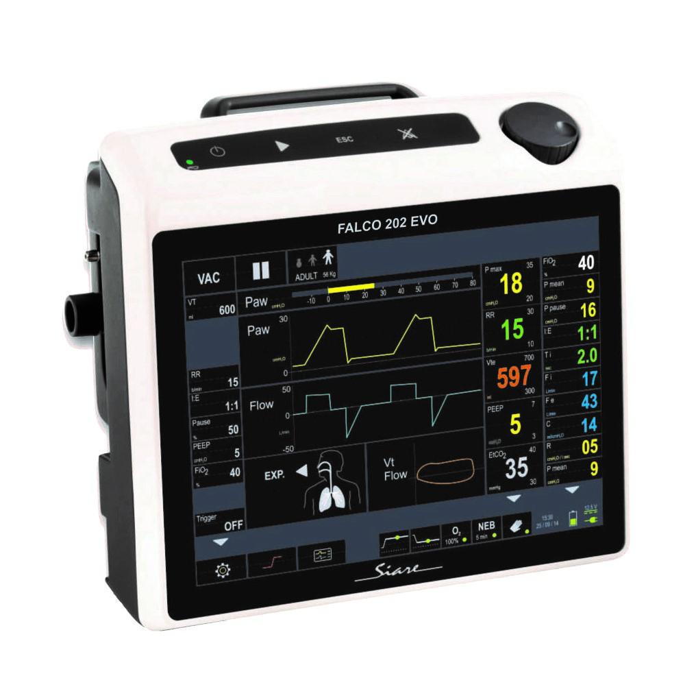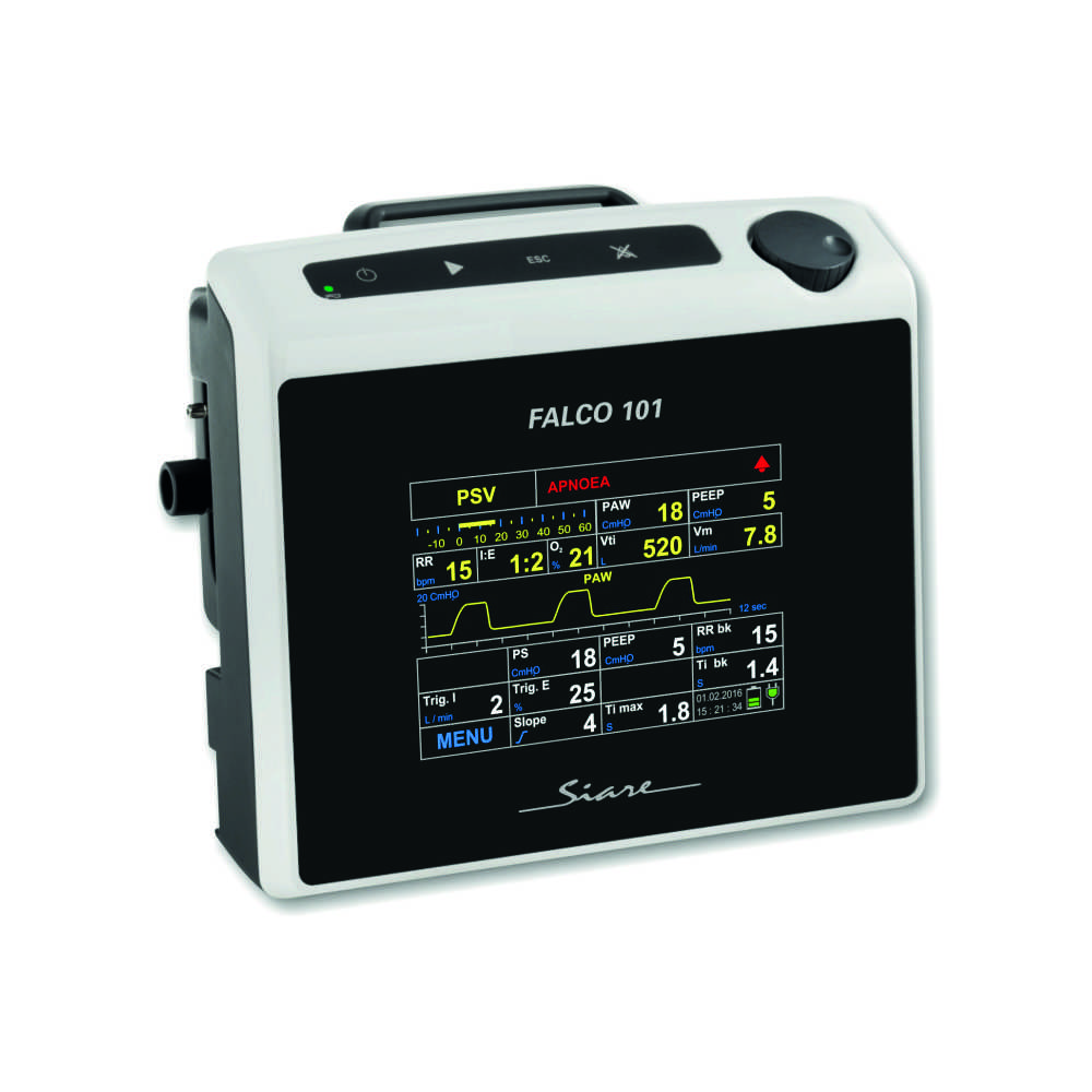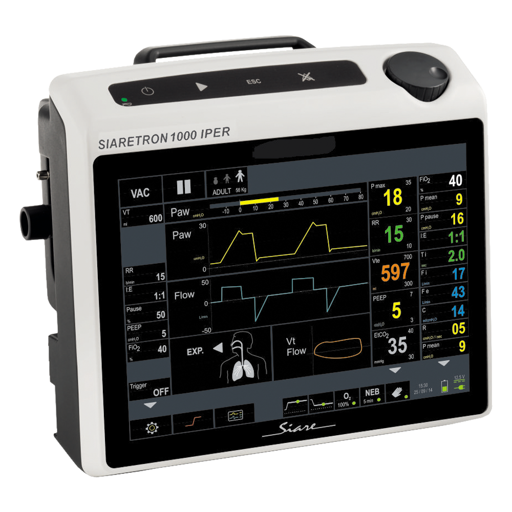 Il sistema di ventilazione Siaretron 4000 15″ eroga ventilazioni controllate o spontanee, con un livello reimpostabile della pressione positiva di fine espirazione (PEEP), della sensibilità trigger e della concentrazione di ossigeno.
